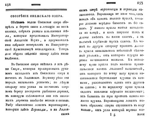 Объехав водою Онежское озеро, обозрел я берега оного и лежащие на них селения, собрал разные ископаемые тела, которые представил Императорской Академии наук, и приумножил ими собрание минералов, в Императорской Кунсткамере находящихся. Теперь для общего сведения опишу здесь мною виденное.