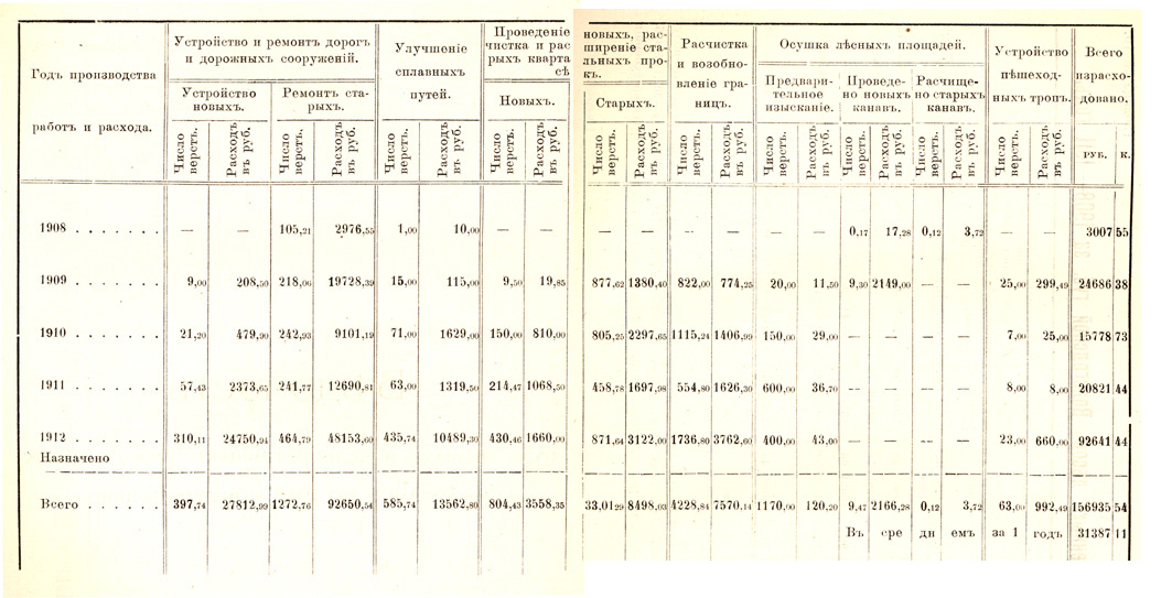 В ином положении находится дело с лесными и мелиоративными работами; потребность в новых дорогах, общего и специального пользования, а равно и в ремонте существующих, признавалось местными лесными чинами с давних пор: неудовлетворительное положение дорожного дела в казенных лесах служило одним из главнейших препятствий к широкому ознакомлению местных лесных чинов с заведываемыми ими лесами и их нуждами.