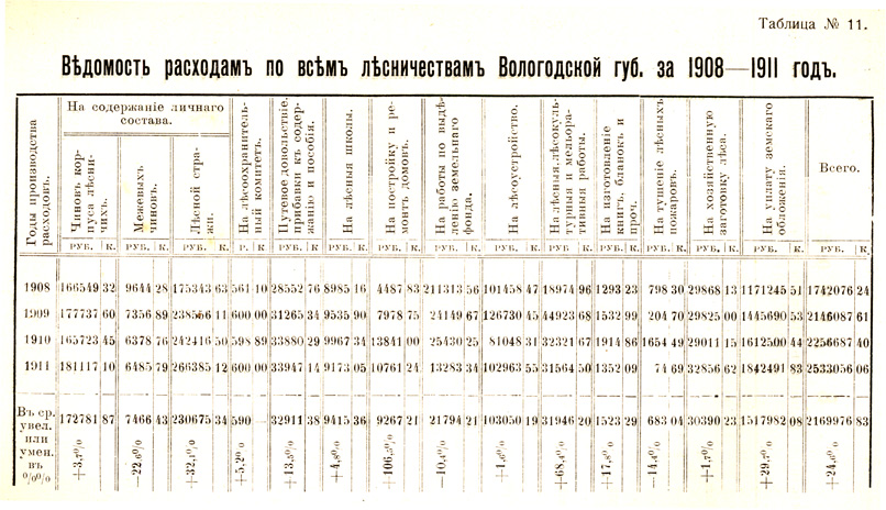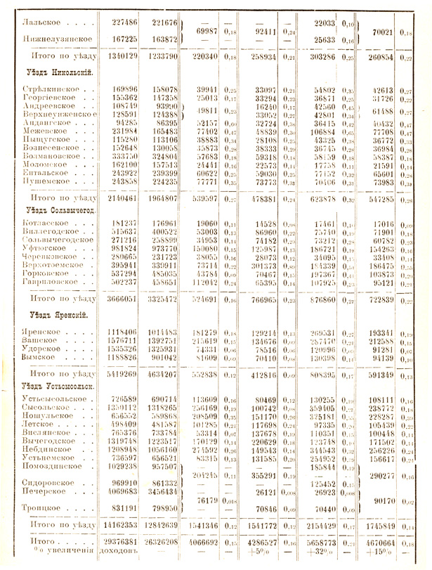 Переводя данные о доходах и расходах на 1 десятину площади казенных владений Вологодской губернии, определяемой в 28.554.33 д., получается, что средний валовой доход с 1 десятины за последние 4 года составляет 14 ? к., расход – около 7 ? к., а чистый доход всего лишь около 7 коп. с 1 десятины общей площади казенных земель и около 8 коп. – с 1 десятины лесной площади. Цифра эта, однако, не может считаться показательной для всей губернии, представляющей в отдельных своих частях глубокие различия в экономических и лесохозяйственных условиях. И действительно, цифра доходности по отдельным уездам сильно варьирует, повышаясь в более населенных уездах с хорошо развитым местным лесопотреблением, и понижаясь в лесничествах менее населенных и культурных частей губернии, обслуживающих почти исключительно внешние рынки, потребляющие только крупные сорта леса.