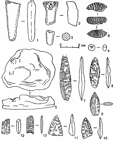 7-11 - наконечники стрел. 1 - 4, 6 - глина; 5 - глина, шлак; 7-13 - кремень