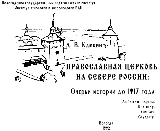 Камкин А. В. Православная церковь на Севере России: Очерки истории до 1917 года. Вологда, 1992.-164 с. Прошлое Русского православия находится ныне под пристальным вниманием широкой общественности, особенно молодежи и тех поколений, чье общение с Церковью было насильственно прервано или затруднено. Книга адресована прежде всего им и восстанавливает историю приходов, монастырей, епархий и духовенства Русского Севера со времен христианизации и до 1917 года. Многие ее страницы основаны на архивных поисках автора и вводят в оборот неизвестные прежде сведения. Автор - А. В. Камкин - кандидат исторических наук, доцент кафедры отечественной истории Вологодского пединститута. Имеет ряд работ по истории Русского Севера XVII-XIX веков, его духовной культуры, общественной жизни и религии. |