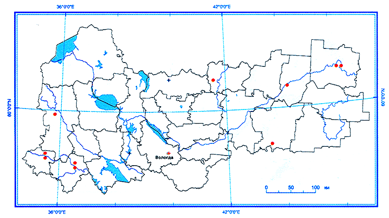 В Вологодской области встречается в Бабаевском (окр. д. Верховье), Бабушкинском (окр. д. Васильевское), Верховажском (окр. с. Чушевицы), Великоустюгском (окр. д.д. Дымково, Кузино, Порог, Анисимово), Нюксенском (окр. г. Нюксеницы), Устюженском (окр. д. Ванское), Харовском (окр. д. Кудрявцево), Чагодощенском (бер. р. Чагода) районах. В литературе указывается для Вологодского, Усть-Кубинского, Шекснинского районов. Н. А. Иваницкий в 1883 г. приводит его для окрестностей г. Вологды. В России встречается на северо-востоке и северо-западе европейской части. За ее пределами - в Скандинавии, Средней Европе. Бореальный европейский вид.