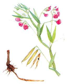 Многолетнее травянистое растение с длинным ветвистым корневищем. Стебли распростертые или восходящие, гра-нистые, по двум граням, ширококрылатые, достигающие иногда 1,5 м длины. Листья перистосложные с 1 парой крупных, до 8-15 см длиной, ланцетных, к верхушке постепенно суженных листочков, ось листа заканчивается усиком; прилистники короче листочков, в основании стреловидные, ланцетные (0,9-2 см длиной). Цветки - 1,5-1,8 см, собраны в кисть, цветоносы обычно длиннее листьев. Венчик снаружи зеленоватый, флаг с внутренней стороны розовый, крылья малиновые. Бобы продолговатые, крупные, до 8 см длиной, голые. Цветет с середины июня по август. Плодоносит в июле - сентябре.