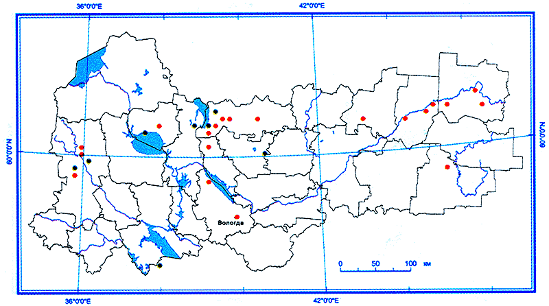 Достоверно известен в нескольких местонахождениях в Бабаевском (окр. д.д. Морозово, Шеино и с. Борисово-Судское), Великоустюгском (окр. д. Порог), Вожегодском (окр. д. Бекетовская, б.н.п. Троице-Енальское), Вологодском (окр. д. Брюхачево), Вытегорском (окр. устья р. Шимки) Кирилловском (окр. д.д. Андреевская, Сивково), Никольском (окр. д. Иваково), Нюксенском (окр. д.д. Березовая Слободка, Леваш, Бобровское), Тарногском (окр. д. Антипинская), Усть-Кубинском (окр. б.н.п. Ухтомица), Харовском (окр. д. Поповка) районах. Для флоры области известен с конца XIX в. А. И. Колмовский (1896) приводит 15 местонахождений вида для бывшего Кирилловского уезда (окр. д. Бекетовская, бер. р. Ильменец и др.), отмечая, что он встречается «почти в каждом еловом лесу с неслишком мокрой почвой». Указывается также для Бабаевского (окр. с. Борисово-Судское, б.н.п. Конецкая), Вашкинского (сев. бер. оз. Белое), Великоустюгского (окр. с. Усть-Алексеево, д.д. Карасово, Смолинская Выставка), Тотемского, Харовского (бер. р. Кубены) районов, для Дарвинского заповедника и г. Вологды. В настоящее время в большинстве указанных точек исчез в связи со сплошными рубками спелых ельников. В России встречается в Арктике, в европейской части (на юге до Новгородской, Ярославской и Московской обл.), на Урале, в Сибири и на Дальнем Востоке, за ее пределами - в Фенноскандии, Эстонии и Северной Америке. Циркумбореальный реликтовый вид.