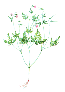 Однолетнее или двулетнее растение 30-45 см высотой. Стебель прямой, ветвистый, с оттопыренными железистыми волосками. Растение с неприятным запахом. Нижние стеблевые листья в очертании пятиугольные, пальчато рассеченные, верхние - почти тройчатые; конечный сегмент листьев с черешочком, боковые - почти сидячие. Цветоносы с двумя цветками, цветоножки после цветения несколько вниз отогнутые. Чашелистики сближенные, по краям и на спинке щетинисто опушенные, с длиной остью. Лепестки цельные, об-ратнояйцевидные, 7-12 мм длиной, в 2 раза длиннее чашечки, розовые, с 3 беловатыми полосками, ноготок их равен отгибу или длиннее его. Плоды дробные, распадающиеся на пять односемянных частей; створки плода сетчато-морщи-нистые. Цветет в июле, плодоносит в августе.