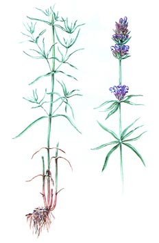 Многолетнее короткокорневищное растение 20-60 см высотой, с несколькими прямостоячими стеблями. Растения голые или почти голые. Все листья линейные или линейно-ланцетные, блестящие, с цельными завернутыми внутрь краями, сидячие, снизу светлые с точечными железками. Цветки обычно по шесть в мутовках, сближенных в продолговатое или головчатое колосовидное верхушечное соцветие 2-6 см длиной. Чашечка с очень коротким опушением или почти голая, 8-11 мм длиной, со слабым пурпурным оттенком. Венчик 20-27 мм длиной вдвое длиннее чашечки, сине-фиолетовый или темно-голубой. Плод - четырехорешек. Орешки довольно крупные, черные. Цветет в июне - июле, плодоносит в августе. Встречается всегда рассеянно, численность уменьшается при развитии густого травостоя. Распространяется преимущественно семенами, в местах с несомкнутым травяным покровом.