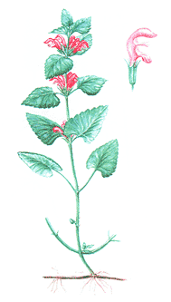 Многолетнее травянистое растение с ползучим корневищем. Стебли приподнимающиеся, укореняющиеся, высотой от 15 до 60 см. Нижние листья мелкие, округлые, остальные яйцевидно-сердцевидные, острые, зубчатые, морщинистые, сверху со светлыми пятнами, короткочерешковые, нижние на более длинных черешках. Все растение жестковолосистое до почти голого. Цветки сидячие по 6-10 в мутовках в пазухах листьев. Прицветные листья на коротких черешках. Чашечка колокольчатая, ее зубцы шиловидные, расходящиеся. Венчик розовый или пурпурный, двугубый, крупный (до 3 см), нижняя губа пятнистая, трубка его изогнута с волосистым кольцом внутри, под которым она стянута. Плод - четырехорешек. Цветет в мае - июне, плодоносит в июле.