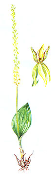 Многолетнее желтовато-зеленое растение (8—40 см высотой). Стебель при основании клубневидно утолщенный, окружен влагалищами старых листьев. Нормально развитый лист на растении один, редко два, причем второй заметно меньше первого. Пластинка листа эллиптическая или продолговато-эллиптическая (3-10 см длиной), суженная в длинный стеблеобъемлющий черешок, соцветие колосовидное, многоцветковое (до 40-60 цветков), 2-15 см длиной. Цветки мелкие, желтоватые или зеленоватые, листочки наружного круга яйцевидные, внутреннего-линейные, губа широкояйцевидная, 2-3 мм длиной, заостренная, цельнокрайняя. Цветет в июне-июле. Популяции М. monophyllos очень динамичны как по общей численности, так и по соотношению возрастных групп. В силу эксплерентности жизненной стратегии вида в его популяциях происходят изменения численности по годам, и растения появляются только на участках с ослабленной конкуренцией. Встречается спорадически и больших скоплений не образует, очевидна тенденция к сокращению численности.