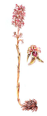 Бесхлорофильное, сапрофитное, желтовато-бурое многолетнее растение с укороченным корневищем, на котором густо располагаются радиально расходящиеся толстые короткие корни, образующие плотное, гнездообразное скопление. Стебель толстый, голый, 20-30 см высотой, с чешуевидными недоразвитыми листьями. Соцветие верхушечное, кистевидное с 18 - 30 цветками. Кисть вверху более густая, чем в нижней части. Цветки желтовато-бурые, 6-8 мм в диаметре, с медовым запахом. Прицветники пленчатые, очень мелкие. Листочки околоцветника яйцевидные, сближенные, губа двулопастная, вниз отогнутая. Плоды - эллиптические коробочки. Завязываемость плодов - 50 - 60%. Интенсивность микоризной инфекции в корнях и корневищах - 70 - 90%, на протяжении всего онтогенеза питается исключительно за счет микоризного гриба. Ведет подземный образ жизни, поэтому обнаружить можно только во время цветения или по засохшим побегам прошлого года, которые обычно долго сохраняются. Цветет в июле, плодоносит в августе. Встречается, как правило, единично. Все изученные популяции малочисленны.