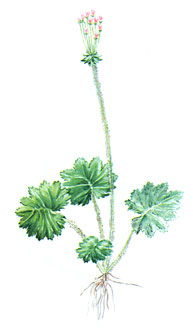 Многолетнее монокарпическое травянистое растение с коротким корневищем. Все листья розеточные, в очертании округло-почковидные, с зубчатыми лопастями, длинночереш-ковые, опушенные рыжеватыми, длинными, отстоящими волосками. Соцветия зонтиковидные, из 10-15 поникающих цветков на безлистных стрелках. Цветки правильные, с колокольчатой чашечкой, которая до середины разделена на ланцетные зубцы, остающейся при плодах. Венчик сростнолепестный воронковидно-колокольчатый, около 1 см длиной, глубоколопастной с малозаметной трубкой, розово-фиолетовый; столбик выдается из цветка. Плод - яйцевидная коробочка, раскрывающаяся створками. Семена мелкие, плоские, угловатые. Цветет в мае - июне, плодоносит в июле. Размножение семенное.
