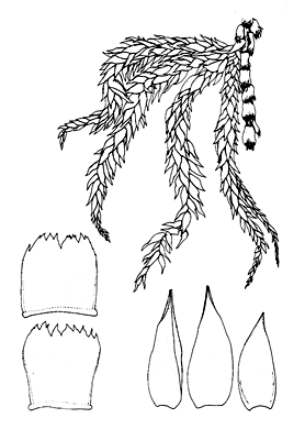Однодомный водный мох, образующий рыхлые, реже густые, желтые до рыжевато-бурых дерновинки в виде ковров. Стебли жесткие, темно-бурые, с 3-5-слойным гиалодермисом. Стеблевые листья 1—1,5 мм длиной и до 1 мм шириной, ко-роткопрямоугольные; верхушка молодых листьев широко закругленная, бахромчатая, у старых листьев становится широко усеченной и зубчатой благодаря быстрому разрушению водоносных клеток верхушки листа. Кайма листа узкая, исчезает к верхушке. Боковые ветви собраны в пучки по 4-5, с 2-3 отстоящими ветвями, с пятирядно расположенными листьями на ветвях. Листья отстоящих ветвей, обращенные в одну сторону, лаково блестящие, 1,5—2,5 мм длиной и 0,5-1 мм шириной, ланцетные.