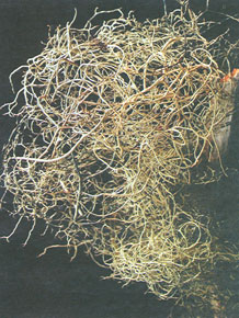Крупный кустистый лишайник. Таллом в виде прядей 20-50 (80) см длиной, свисающий, очень жесткий, прикрепляется к субстрату основанием или в разных местах гаптерами. Веточки таллома 2,5-3 мм в диаметре, цилиндрические, часто со сжатыми кончиками, изредка дорзовентрально сжатые и перекрученные, изотомически-дихотомически разветвленные, однообразно окрашены в зеленовато-серый, зеленовато-желтоватый, желтый или соломенно-желтый цвет, кончики веточек могут иметь темный оттенок. По веточкам обильно разбросаны слегка вогнутые, плоские или выпуклые псевдоцифеллы до 1 мм длиной, белого цвета и веретено-видной формы. Сорали редкие, бугорчатые или слегка выпуклые, овальной формы, чаще белого или реже сероватого оттенка. Апотеции встречаются редко, латеральные, округлой формы до 5 мм в диаметре, молодые вогнутые или плоские, позднее - выпуклые, их диск красновато-коричневый, гладкий, блестящий или слегка матовый. Талломный край апотециев тонкий, цвета таллома. Размножается преимущественно соредиями.