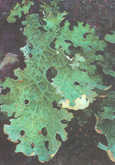 Очень крупный листоватый лишайник. Таллом до 30-50 см в диаметре, образует розетки округлой или неопределенной формы, к субстрату прикрепляется неплотно. Лопасти достаточно толстые, хрящеватые, глубоко вырезанные, дихотомически ветвящиеся. Верхняя поверхность серовато-зеленая или зеленовато-коричневатая с оливковым оттенком, во влажном состоянии ярко-зеленая, более или менее блестящая и гладкая, особенно по краям, сетчато-ребристая, между ребрами с углублениями, на нижней поверхности им соответствуют вздутия. На ребрах и по краю лопастей образуются цепочки беловатых или серых округлых соралей, реже здесь же развиваются изидии цвета таллома. Нижняя поверхность желтовато-коричневатая до темно-коричневого цвета, особенно в центре таллома, с голыми вздутиями и желобками между ними, обычно покрытыми густым ворсом коротких ризоидов, часто встречаются пучковидные или простые ризины. Апотеции встречаются довольно редко, сидячие или на очень коротких ножках, располагаются на ребрах или по краю лопастей, имеют округлую форму. Диск апотециев около 4-6 мм диаметром, молодой - вогнутый или плоский, старый - слегка выпуклый, красновато-коричневого цвета, талломный край одного цвета с верхней поверхностью таллома. Вид размножается преимущественно соредиями.