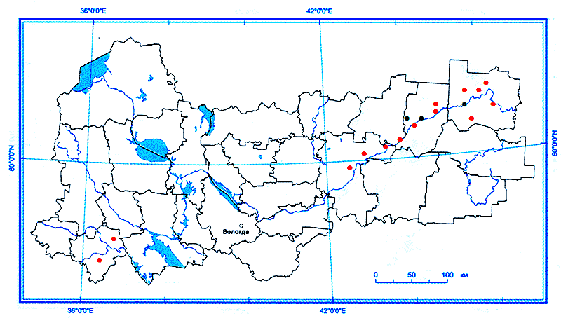 В области местонахождения вида обнаружены в Великоустюгском (окр. г. Великий Устюг, д.д. Царева Гора, Лодейка, Красово, Дымково, Нижние Исады, Шастово, Гаврино, Савино, Порог, Студеное, г. Красавино), Нюксенском (окр. д.д. Брусенец, Копылово, Монастыриха и бер. р. Городишна), Тотемском (БЗ «Пиньга», д. Коченьга, бер. р. Царева), Устюженском (окр. г. Устюжна, д. Мережа) районах. Вид впервые был отмечен в 1910 г. А. П. Шенниковым в Нюксенском районе (окр. д. Бобровское), в 1911 г. в Великоустюгском (окр. д. Порог) и Нюксенском (окр. д. Заболотье) районах. Эти местонахождения были подтверждены более поздними находками. В России распространен в европейской части, Западной и Восточной Сибири. Вне России встречается на крайнем востоке Средней Европы, в Средней Азии. Бореальный евразиатский вид.