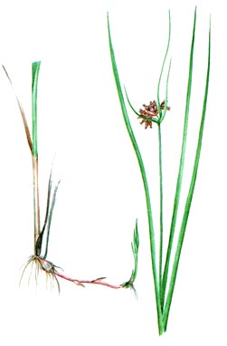 Многолетнее растение 50-80 см высотой с подземными длинными корневищами и клубнями. Стебли остротрехгранные, вверху шероховатые. Нижние чешуевидные листья в основании побегов темно-бурые, при старении распадаются на простые волокна. Срединные листья - с трубчатым влагалищем и листовой пластинкой 3-8 мм шириной, снизу с выступающим килем, по краю гладкие. Листья соцветий - без влагалищ, с листовыми пластинками, превышающими веточки щитковидно-зонтиковидного соцветия. Наиболее длинные веточки соцветия могут нести группу из 2 - 4 сближенных колосков. Колоски многоцветковые, цилиндрические, от овальных до удлиненно-ланцетных, 15-25 (40) мм длиной, буро-коричневые. Кроющие чешуи цветков черепитчатые, эллиптические. Околоцветник из 5-6 неравных щетинок, с многочисленными направленными вниз шипиками. Тычинок три. Орешек обратнояйцевидный, гладкий, блестящий, около 3 мм длиной, выпукло-трехгранный, темно-коричневый. Цветет в июле. Плодоносит в августе - сентябре. При понижении уровня воды в природных водоемах и появлении обнаженных субстратов происходит успешное семенное возобновление вида. В период поднятия уровня воды и при затоплении недавно обнаженных участков грунта происходит энергичное развитие корневищ и в дальнейшем клонирование особей.