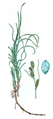 Многолетнее травянистое длиннокорневищное растение 30-70 см высотой. Стебли прямостоячие, крепкие, остроугольные, наверху шероховатые, у основания окружены красноватыми влагалищами. Листья линейные, длинно заостренные, книзу килеватые, жесткие, серовато-зеленые, короче стеблей, 2-3 мм шириной. Соцветие 5-10 см длиной, из 4 (5) расставленных прямостоячих колосков. Верхушечный колосок булавовидный или продолговато-яйцевидный, 1-2 см длиной, гинекандрический (вверху с пестичными, внизу с тычиночными цветками). Боковые колоски в числе 2-3 (4) яйцевидные или продолговато-яйцевидные, 1-1,5 (2) см длиной, 6-10 мм шириной, целиком пестичные. Нижний прицвет-ный лист с линейной пластинкой, равной соцветию, или длиннее его. Кроющие чешуи яйцевидно-ланцетные, коричневые или пурпурно-коричневые, с шиловидной шероховатой остью, вдоль средней жилки покрыты сосочками. Мешочки эллиптические, голубовато-серые, с жилками, с коротким широко полулунно выемчатым носиком, с расходящимися зубцами. Рылец три. Цветет в июне-июле, плодоносит в июле-августе.
