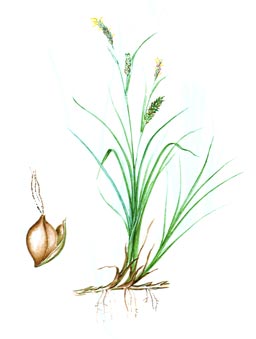 Многолетнее травянистое растение 10-50 см высотой, с ползучим корневищем. Стебли прямостоячие, гладкие, тупотрех-гранные. Листья сизо-зеленые, прямые, 2-4 мм шириной, длинно заостренные, жесткие, короче стеблей. Колоски в числе 2-4, расставленные, верхний - с тычиночными, остальные - с пестичными цветками. Тычиночный колосок 1-2,5 см длиной, чешуи ржавые, с белоперепончатым окаймлением, лучше выраженным в нижней части колоска. Пестичные колоски 1-2,5 см длиной, рыхловатые, на ножках до 2-3 см длиной; чешуи от яйцевидных до широкояйцевидных, ржаво- или черно-бурые, короче мешочков. Мешочки около 4 мм длиной, яйцевидные, зеленовато-желтые, в верхней половине с мельчайшими сосочками, заостренные в короткий изогнутый носик. Цветет в мае - июле. Плодоносит в июне - августе.