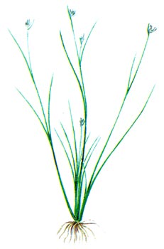 Многолетнее растение 15-40 см высотой, с коротким членистым корневищем (0,1-5 см). Стебель, как правило, одиночный (реже 2-3) выходит из пазухи чешуевидного листа корневища, трехгранный, тонкий, диаметром 0,7-1,5 мм. Нижние чешуевидные листья обычно в числе 3-5, бурые, пленчатые, ланцетовидные. Стеблевые листья линейные 1-15 см длиной, до 2 мм шириной, желобчатые, на спинке с килем и цельными трубчатыми влагалищами. Соцветие из 1-3 плотных щитковидных пучков. Колоски собраны по 1-3, на коротких ножках, ланцетовидные, острые, беловатые. Околоцветные щетинки в числе 7-15 не превышают по длине плод. Орешек сжатый, обратнояйцевидный, 1,5-2 мм длиной и около 1 мм шириной, постепенно заостренный в гладкий носик. Надземные побеги формируются поздней весной или в начале лета из зимующих почек возобновления, которые представляют собой луковицеподобные структуры с мясистыми листьями, выполняющими запасающую функцию. Они могут отделяться от материнского растения и давать начало новым растениям. Цветет с июня. Плодоносит в июле - августе.