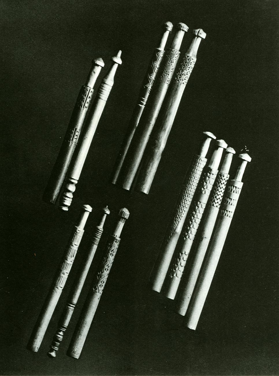 Палочки для плетения кружев. Делались из твердых пород дерева. Нижняя часть коклюшек, свободная от ниток, покрывалась мельчайшей резьбой. Узоры ее чрезвычайно разнообразны и в то же время просты. Они составлены из треугольников, ромбов, квадратов во всевозможных сочетаниях, зигзагообразных полос, звездочек. |