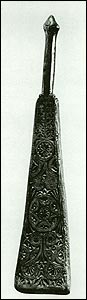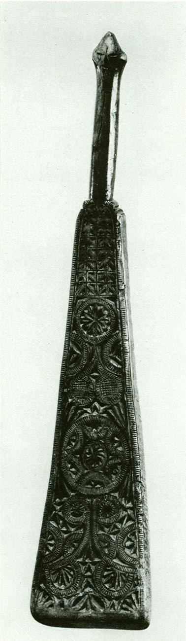 От прямой ручки рубель постепенно расширяется к концу. Напоминает по форме валек, но гораздо длиннее его и имеет ребристую нижнюю поверхность. Верхняя плоскость густо покрыта неглубокой трехгранновыемчатой и контурной резьбой. Розетки и полурозетки соединены между собой длинными чуть изогнутыми, орнаментированными лентами, что придает дробному рисунку целостность. Узкая часть рубеля покрыта мелким узором из пересеченных по диагонали квадратиков. |