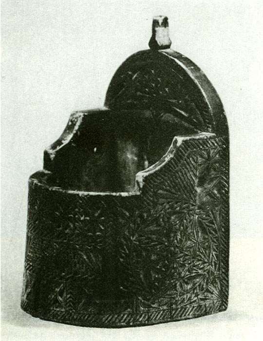 Солоница в виде кресла: округлая вверху спинка и округлый перед без граней. На подлокотниках «кресла» сохранились отверстия, где крепился вертлюг крышки. Вся поверхность покрыта тончайшей геометрической резьбой. Мелкий узор словно мерцает сотнями граней своих сложных композиций. Она отличается блестящей техникой резьбы, редким разнообразием орнаментальных композиций, большим чувством формы предмета и пониманием красоты материала. Эту солоницу, по-видимому, следует связывать с районами Волги.