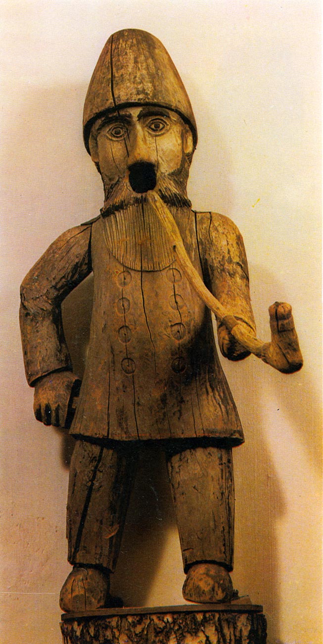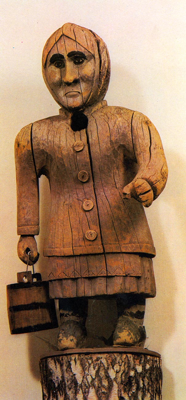 Один скворечник сделан в виде скульптуры, изображающей старика. Рот служил летком для скворцов. Это уникальное произведение искусства, не типичное для быта крестьян 19 века. Как удалось выяснить сотрудникам Государственного Исторического музея, их автор, крестьянин Савинов Василий Тимофеевич, за свою жизнь сделал очень много подобных деревянных скульптур и массу предметов быта с рельефными и объемными изображениями человека. Многие из них хранятся в фондах ГИМ и поступили туда в 1895 году. Второй скворечник сделан в виде старухи с ведром и с палкой в руках, вероятно, задуман как парный к первому. Леток для скворцов устроен под подбородком. И в том и в другом скворечниках до сих пор сохранились гнезда их бывших жильцов. |