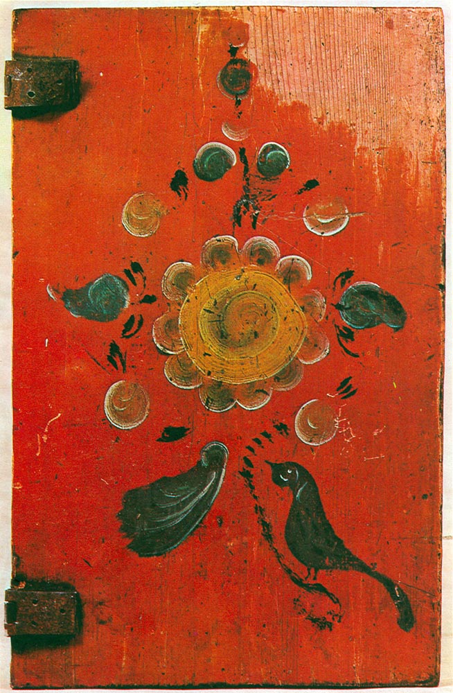 Створка судницы — низкого шкафа для посуды в пять-шесть створок, идущего вдоль стены от печи до окна. В районе Цивозера и по всему среднему течению Северной Двины подобная роспись с изображением скворцов и растений встречается довольно часто. Мастера иногда ставили на эти вещи свои имена и даты. |