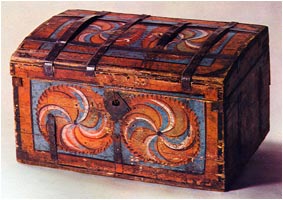 С выгнутой крышкой. Окован полосами железа и покрыт крупной росписью, основным элементом которой является вихревая розетка. Роспись предельно простая и очень декоративная. В таких сундуках хранили одежду, и стояли они обычно вдоль бревенчатых стен в холодной горнице, а если не умещались в один ряд, то их ставили пирамидами один на другой. Пестрая и нарядная роспись сундуков, сундучков и коробеек делали помещение горницы ярким, красивым. |