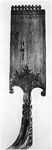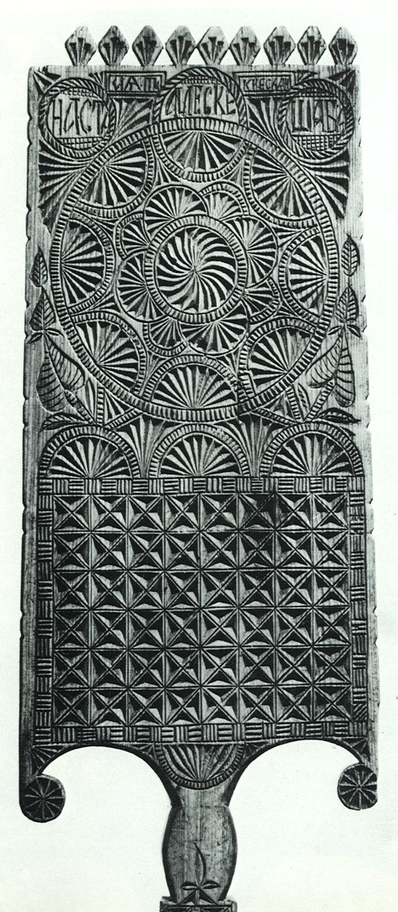 53, 54. Прялка. 1890 год. Вологодская область, Тарногский район, деревня Денисовская. Характерный образец тарногской прялки: на стройной невысокой ножке огромная лопасть с двумя круглыми «серьгами» и рядом ромбической формы зубчиков — «городков». Под городками вырезана надпись: «СИЯ ПРЯ(ЛКА) КРЕСТЬЯН(КИ) НАСТА(СИИ) АЛЕКСЕ(ЕВНЫ) ШИБА(НОВОЙ)». Лопасть прялки (фасадная сторона) мастер превратил в роскошное декоративное панно с четкой стройной композицией. Основа ее — узор из мелких квадратов. Над ним сложная композиция из розеток, в центре которой — вихревая розетка, считавшаяся в древности символом грома. На внутренней стороне лопасти этой прялки орнамент украшает лишь нижнюю часть, оставляя гладкой середину, куда прикреплялся лен. По верху лопасти идет надпись: «СИЮ ПРЯСН (ИЦУ) РАБ(ОТАЛ) КРЕ(СТЬЯНИН) ДЕР(ЕВНИ) ДУБ( ) СТЕП(АН) ОГЛОБ(ЛИН) 1890 ДЕКАБРЯ 29 ДНЯ». Эта прялка — уникальное произведение искусства. Все в ней гармонично, все свидетельствует о большом таланте художника, который вырезал свое имя. Подписные вещи редкое явление в русском народном искусстве.