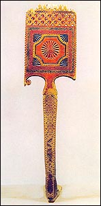 Тотемская прялка резалась из одного куска дерева (северный тип прялки). Местное название — «пресница». Ее следует считать одной из основных разновидностей второго вологодского типа по классификации А. А. Бобринского. Делалась и бытовала в районе города Тотьмы по рекам Сухоне, Цареве и Вожбол. Высокая стройная ножка увенчана крупной квадратной лопастью, верхнюю часть которой украшает сквозная решетка и плотный ряд городков. На нижней части лопасти две крупные загнутые к ножке серьги. Фасадная сторона ее покрыта трехгранновыемчатой резьбой: центр композиции занимает розетка, по краю — плотный узор из квадратов и треугольников. По резьбе тотемские прялки расписывались маслом. Роспись подчеркивала композицию резного узора. Форма тотемской прялки легла в основу еще нескольких разновидностей этой формы: прялки Погорелова, прялки с рек Толшмы и Печенги, из соседних Сокольского и Междуреченского районов и прялки Совеги Солигаличского района Костромской области. |