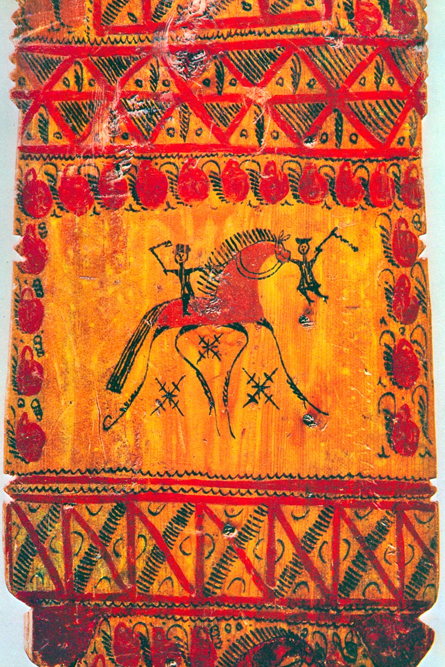 На внутренней стороне лопасти мезенской прялки изображена сцена верховой езды. В 19 веке эту часть лопасти, там, где привязывался лен или шерсть, художники Палащелья стали украшать композициями жанрового характера. Здесь изображена характерная для мезенских росписей фигурка конька на длинных тонких ножках, очень стилизованная и решенная декоративно, с крохотным всадником. Такой же маленький человек висит на уздечке этого коня (видимо, держит коня под уздцы). Явная несоразмерность фигур не мешает выразительности сцены, решенной очень живо и по-детски наивно.