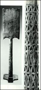 Круглоствольная, лопатообразная калининская прялка в классификацию А. А. Бобринского не вошла. Была впервые найдена экспедицией Загорского музея (1963, Л. Э. Калмыкова). Она является последним этапом эволюции древней формы прялки со сплошной доской, идущей от донца до лопатообразной прялки на круглой ножке. Севернее, в районах связанных с Волгой и ее притоками, эта форма крупной лопатообразной прялки как бы мельчает: меньше становится ее лопасть, три пологие выступа наверху получают более четкие очертания. Изменяется и ее конструкция: круглая ножка крепится в донце на винт. Именно эту форму прялок А. А. Бобринский назвал тверской и выделил в самостоятельный седьмой тип. Она бытует и в юго-восточных районах Новгородской области, которые тоже связаны с притоками Волги. Тверскую прялку (Калининская обл.) следует считать одной из разновидностей волжской столбчатой прялки, которая проникла далеко на северо-запад. |