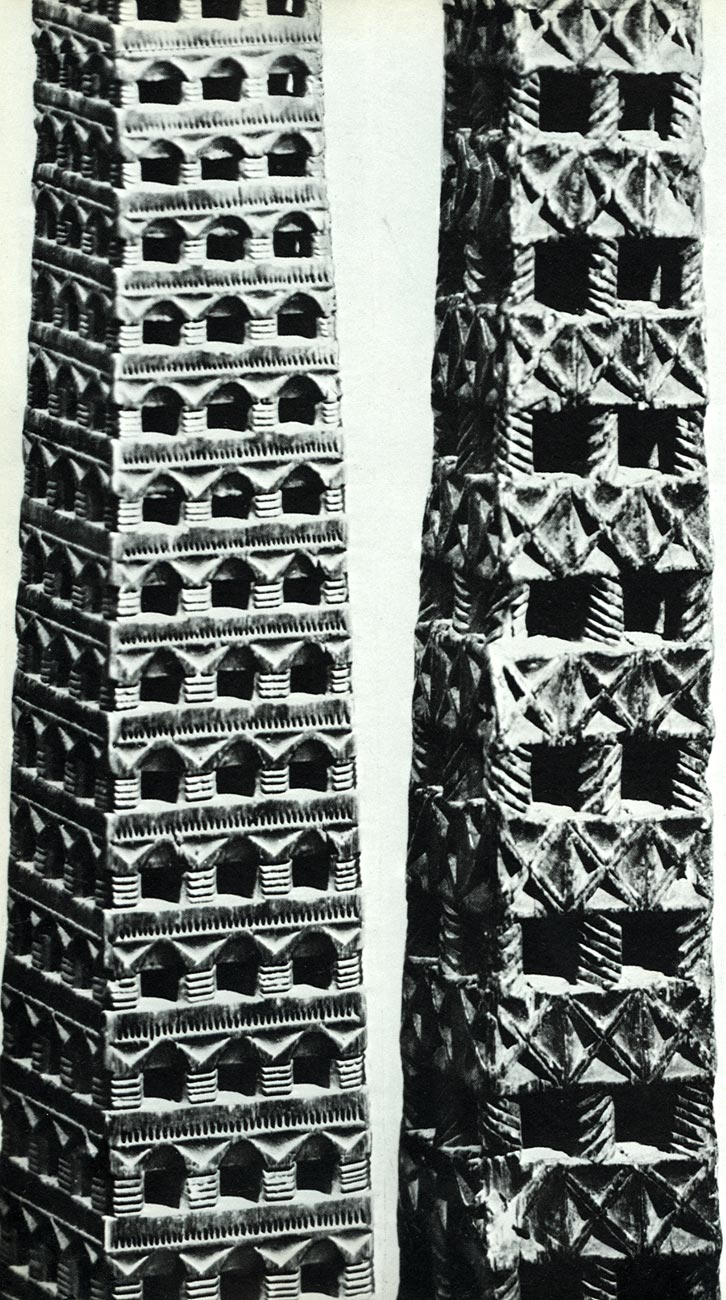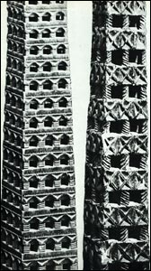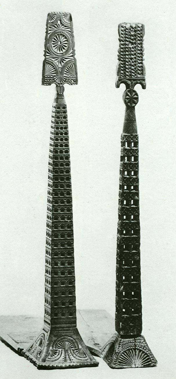 Прялка. 19 век. Ярославская область, Некрасовский район, село Вятское Наиболее яркие разновидности волжского столбика. Ее форма и резной декор окон с сандриками напоминают высокие стройные шатры каменных колоколен 17 века. Она состоит из донца и вставленной в него ножки с небольшой лопастью. Исследования последних лет выявили целую группу разновидностей столбчатых прялок, связующим звеном между которыми является их конструкция — донце и вставляющийся в него стояк с маленькой головкой. Эту форму мы встречаем только в районах, прилегающих к Волге и ее притокам (в Костромской, Ярославской, в западной части Вологодской, в восточной части Новгородской и в Калининской областях). Форма ярославского столбика с окошечками была положена в основу восьмого типа прялок по классификации А. А. Бобринского, без точного указания мест их бытования. Экспедицией Загорского музея была определена эта территория (1966, О. В. Круглова): она занимает Середской район и северную часть Некрасовского района Ярославской области. Основными центрами производства были село Вятское и соседние деревни. Резчики прялок взяли за образец каменные шатровые колокольни 17 века с разбросанными на белой глади шатра оконцами, верхняя часть которых обычно была украшена объемным сандриком. Этот мотив нарядных оконец повторяется так много раз, что сплошь покрывает все грани деревянной башенки. Простенки между окнами заполнены витыми колонками. В резьбе поражает тщательная отделка каждой детали и блестящая техника выполнения. |