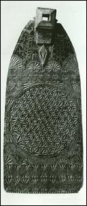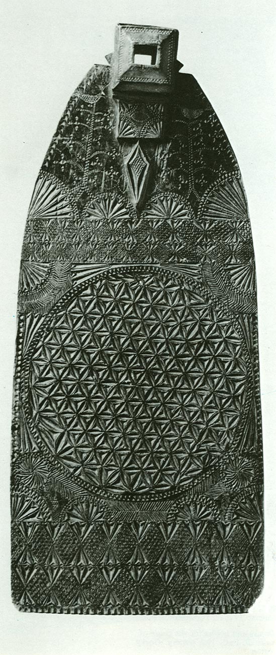 На закругленном конце широкой доски вырезана массивная головка с отверстием, куда вставлялся гребень. Подобная форма широкого донца, закругленного у головки, характерна для среднего Поволжья (широко известные городецкие донца). По-видимому, это донце сделано в Ярославской или в Костромской областях, в районах, лежащих на Волге. Именно этот древний водный путь мог повлиять на общность формы донец этих центров. Вся поверхность донца густо покрыта резьбой. Центр композиции занимает огромная розетка с дробным мелким узором. Виртуозная техника резьбы и красота узора ставит этот предмет крестьянского быта в число уникальных произведений народного искусства. |