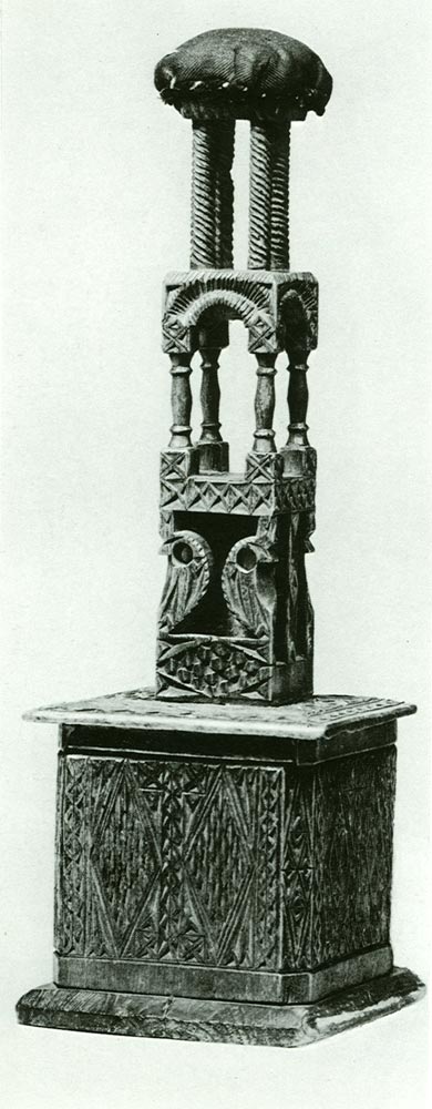 Столбик этой швейки имеет вид башенки. Грани кубической формы ящика с выдвижной крышкой покрыты трехгранновыемчатой резьбой. Основу композиции составляют крупные ромбы. Их изящная форма подчеркнута мелкой резьбой. Верхнему ярусу башенки легкость придают фигурные резные колонки. Одни из них напоминают фантастических коньков, другие скручены в жгут. Средний ярус швейки завершает нарядная сень, она делает ее ножку похожей на сказочное архитектурное сооружение. |