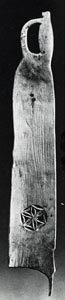 Форма трепала традиционна для Вологодской области. От ручки трепало постепенно расширяется и заканчивается двумя острыми выступами. Его декор отличается исключительной сдержанностью. Мастер использует резьбу предельно скупо. Кажется, что он умышленно сохранил фактуру материала и лишь на самом конце трепала бросил легкую и хрупкую розетку. Конец ручки закончен стилизованной головкой коня. |