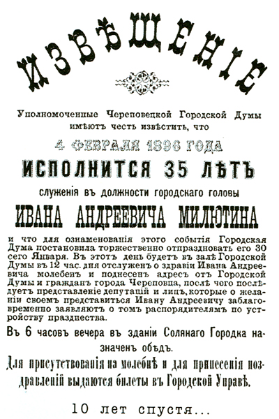 А дело было в том, что члены череповецкой Думы решили с особой торжественностью отметить 25 – летнюю годовщину служения Ивана Андреевича Милютина в должности городского головы – «служения трудного, безупречного и крайне плодотворного, которым он стяжал себе громкую известность, простирающуюся далеко за пределы родного города».