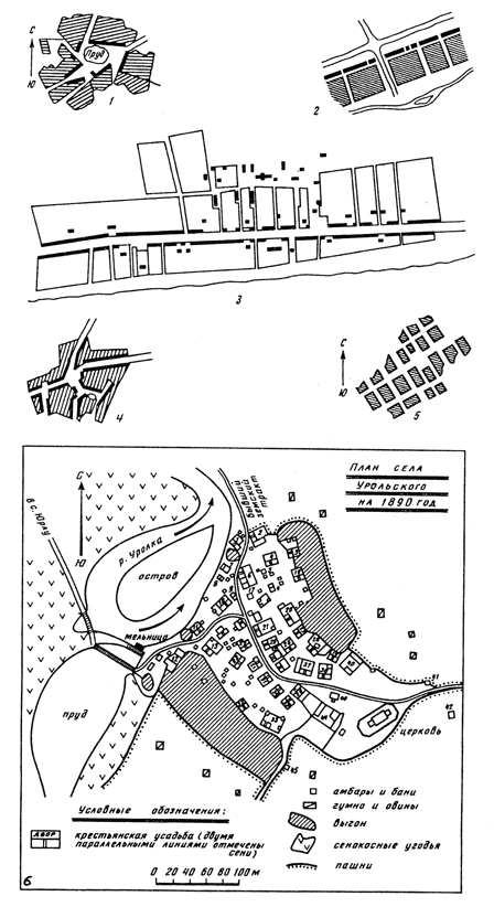 В XVIII-XIX вв. на территории России бытовали разнообразные типы сельских поселений, особенности которых сложились еще в далеком прошлом. Множество старинных селений располагались на тех же самых местах, на которых они отмечались еще в писцовых книгах XVI-XVII вв., в их планировочной застройке и названиях сохранялись старые традиции. Тысячи селений появились позднее, но в их характере, местоположении, планировке прослеживались традиционные особенности.