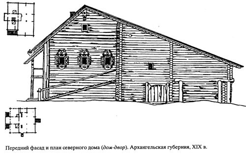 В северных селениях России - в Архангельской, Вологодской, Олонецкой, Пермской, Вятской, северных уездах Новгородской, Ярославской, Костромской губерний возводились большие высокие срубные постройки, включавшие в одно целое жилые и хозяйственные помещения. Пол жилых помещений из-за сурового
