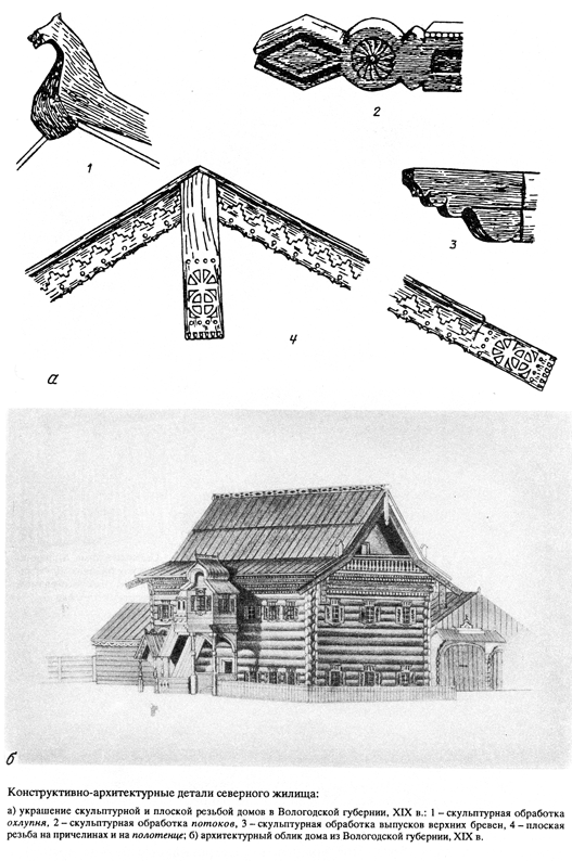 На фасаде высоких рубленых изб в северных селениях прорубалось несколько окон; постройку оживляло крыльцо при входе в дом, балкон на рубленом фронтоне и галерея, нередко опоясывающая дом.на уровне окон. Архитектурный облик северной избы необычайно красив и живописен. Плоские дощатые поверхности стен и кровли украшались изящной плоской геометрической резьбой или прорезью, расписывались красками. Округлые концы выступающих слег и бревен кровли (охлупня, куриц, повалов, водопусков и др.) обрабатывались в пластичные скульптурные формы животных, птиц и разнообразных геометрических фигур.