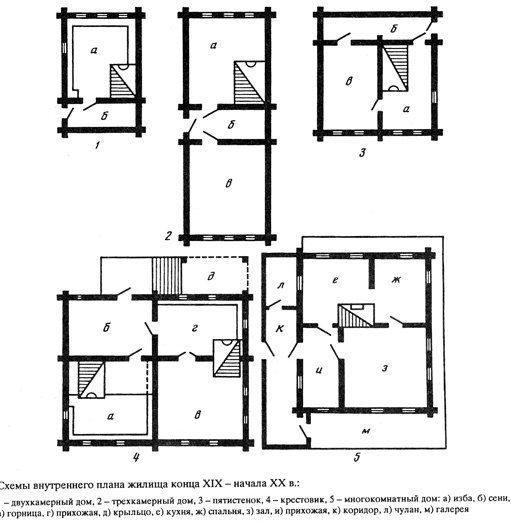 На всей территории расселения русских в XVIII-XIX вв. были распространены двухкамерные и трехкамерные дома, состоявшие из двух или трех основных частей - избы (хаты), сеней и клети или второй жилой избы, связанных друг с другом в единое целое под общей крышей. Основной частью жилого дома была отапливаемая изба, в южнорусских губерниях, на Кубани ее называли и называют хатой. Клеть (горница, селъник) — неотапливаемое помещение служила летним жильем или кладовой. Здесь висела праздничная одежда, стояли коробья и сундуки с холстами и одеждой, кадки с крупой, маслом, яйцами, на полках и лавках хранились льняная пряжа, трепанный лен, веретена, прялки, посуда и прочая домашняя утварь. У бедных хозяев в клети были и сусеки для зерна и муки. Под клетью, там где пол был приподнят над землей, держали корыта, кадки, зерно, муку и пр. Клеть обычно соединялась с избой посредством сеней, но могла стоять и отдельно от дома. Сени (сени, сенцы) в восточнославянском жилище, в отличие от построек народов Западной Европы, были неотапливаемым хозяйственным помещением. В сенях обычно стояла лавка с ведрами и подойниками, нередко досчатая кровать или нары, на которых летом спали, а зимой клали ступы, в которых женщины толкли льяные или конопляные мочки, хранилась и другая домашняя утварь. На стенах висела конская упряжь, рабочая одежда, ближе к потолку или кровле (во многих районах южнорусских губерний сени потолка не имели) прикрепляли коромысла, серпы, косы, грабли и пр.