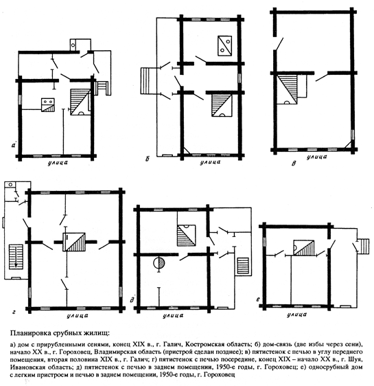 При переносе жилища из деревни в город дом, естественно, сохранял ту же срубную конструкцию, иногда с некоторыми добавлениями. Дома из нового материала, которые сооружались вчерашними сельскими жителями, - собственноручно либо местными плотниками, также выполнялись в традициях русского бревенчатого зодчества. Все они представляли собой широко известные в крестьянском строительстве виды срубов - дом с прирубом, пятистенок. В последние десятилетия также возводились односрубные многокомнатные дома, приближающиеся к квадрату. Такие дома появились уже в конце XIX - начале XX в. в городах и селах России.