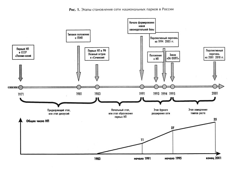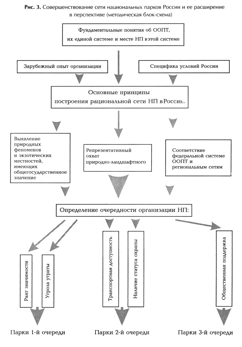 Очевидно, что одновременное создание всех предлагаемых парков или хотя бы значительной их части практически нереально, да и нецелесообразно. Это тем более справедливо, если учитывать суровые экономические и социальные реалии сегодняшнего дня, когда дальнейшее быстрое расширение сети НП оказывается невозможным по целому ряду организационных, финансовых и даже политических причин. На первый план сейчас выдвигается задача не количественного, а скорее качественного свойства, а именно – поддержание и стабилизация уже существующих парков.