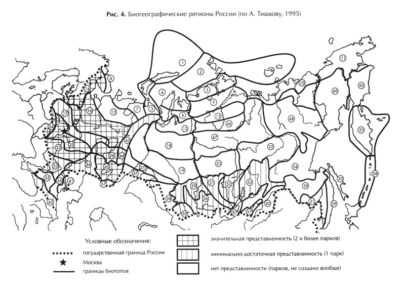 Чтобы обосновать распределение парков согласно принципу репрезентативности, необходимо выбрать подходящую географическую основу. В качестве таковой была взята разработанная А. А. Тишковым (1995) сетка биогеографических регионов (биорегионов), общее количество которых в пределах Российской Федерации – 58. Это природное деление учитывает комплекс природно-ландшафтных и особенно биогеографических факторов, что позволяет разделить всю территорию страны на целый ряд участков, называемых биорегионами, у каждого из которых своя специфика. Перечень и схема расположения биорегионов России приведены в Приложении.