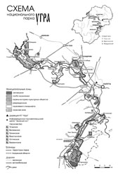 Национальный парк «Угра» располагается на территории шести административных районов Калужской области и включает три основных участка: Угорский, Воротынский, Жиздринский – и три кластерных, которые отстоят от основных на расстояние 3 – 8 км (см. схему парка).