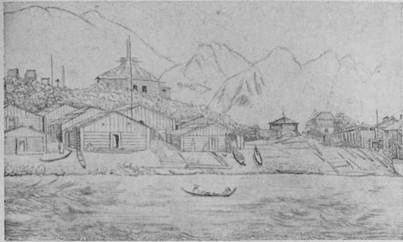 За школой, в линию с крепостной стеной, находится двухэтажная батарея. В нижнем помещаются различные артиллерийские принадлежности; в верхнем стоят 6 восьмифунтовых пушек, которыми имеет честь командовать описатель Новоархангельска. Пушки направлены на колошенское селение, протягивающееся от самой стены вдоль по берегу залива, но кажется с въезда своего на батарею, исключая экзерциций для обучения людей, производящихся здесь нередко, не были употреблены в действие ко вреду человека. Далее, отступя несколько от стены, расположена кухня, в которой приготовляется от Компании кушанье на всех промышленников. В ней отгорожено переборкой отделение для литейной, на которой было много работы при постановке машины на пароход и отливаются вообще все медные вещи для мореходных судов, как-то: поручни, рулевые петли и пр. От кухни под прямым углом идет забор, отделяющий колошенский рынок от селения; забор примыкает к флигелю, занимаемому чиновниками, в том числе и моей особой. Инструмент прохождения, помещенный в будке с подъемными рамами, примыкающей ко второму окну моей квартиры, есть последний предмет на правой стороне круга моего зрения.