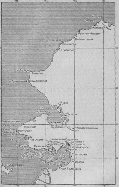 В проживание мое в Михайловском редуте в 1842 и 1844 годах я имел свидания с туземцами северного берега Нортонова залива и проживающими на острове Укивок. Некоторые из них и в том числе Утуктак, толмач экспедиции Кашеварова, посещали прибрежье Ледовитого моря до мыса Барро. Сведения, собранные мною о топографии того края, с пользою могут послужить руководством тому, кто первый будет избран для основания сношений наших с племенами, занимающими берега к северу от последнего нашего заселения в Уналаклике. Не ручаюсь, что с показания туземцев я окончательно верно поместил места туземных жил по их географическому положению, но убежден опытом, что путнику весьма важно знать заранее, в каком многолюдстве и при каких пунктах он встретит туземцев: по этому и располагаешь и ходом, и провизиею, и бдительностию. К северу от Коцебу-зунда я руководствовался картой, составленной туземцем Утуктаком и проверенной Кашеваровым во время обзора берега Полярного моря в 1838 году.