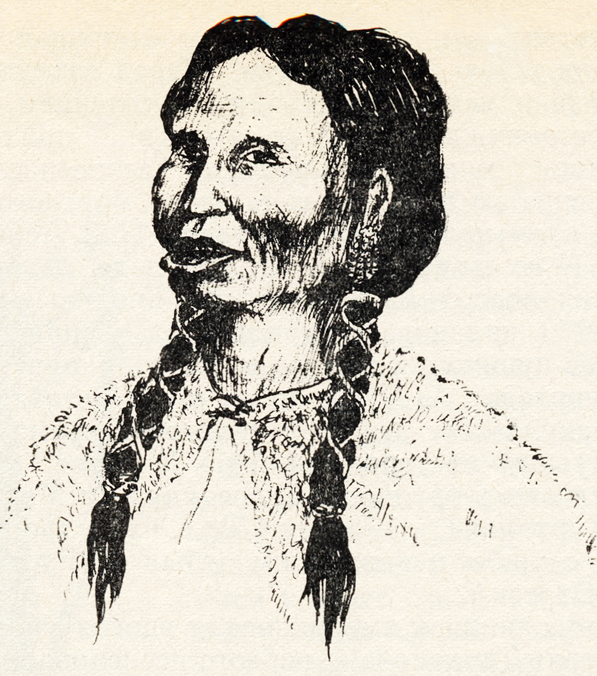 Тлинкитка с деревянной «калужкой» — втулкой, вставленной в разрез под нижней губой. Рис. автора статьи