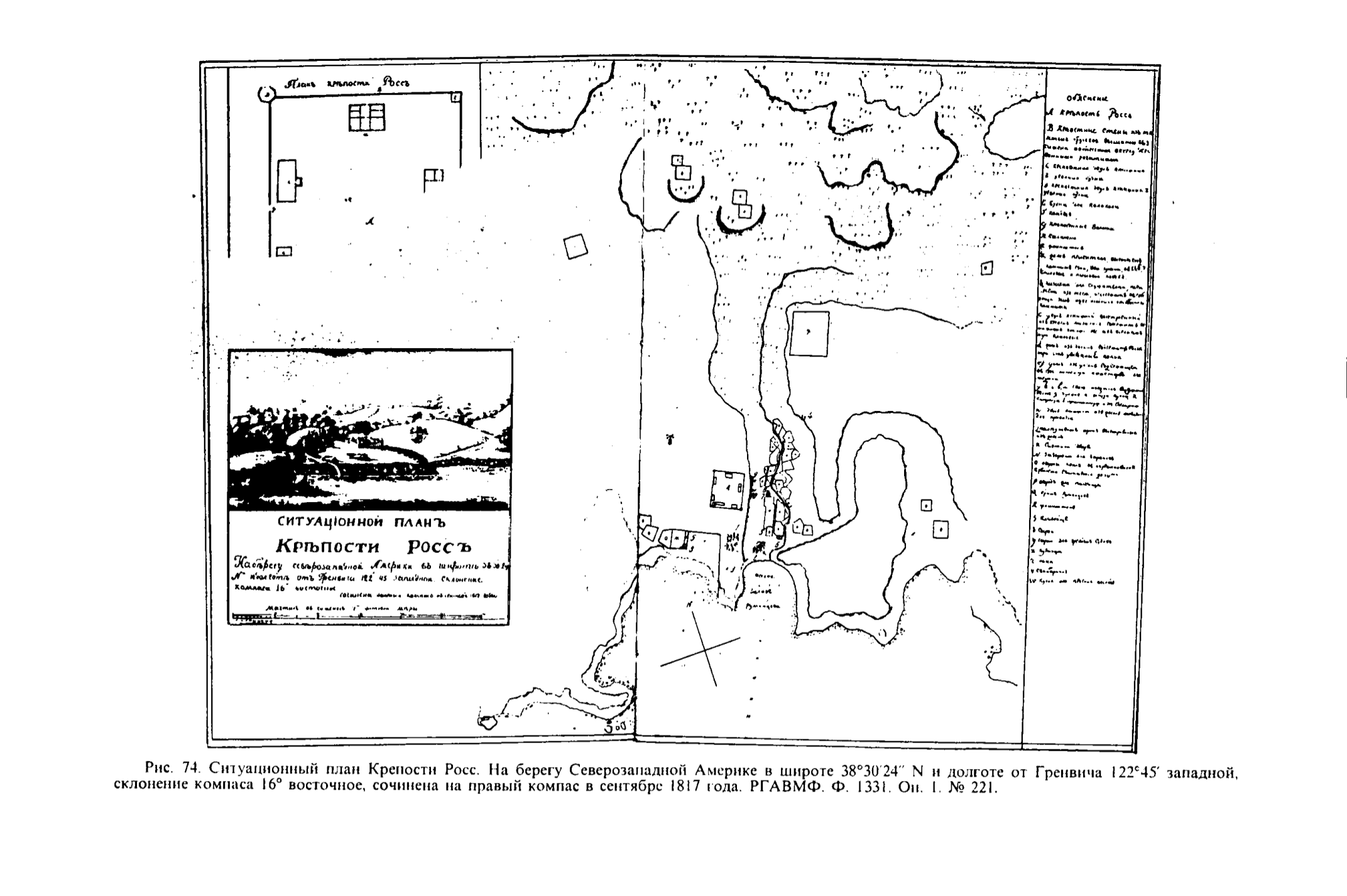 Рис. 74. Ситуационный план Крепости Росс. На берегу Северозамадной Америке в широте 38°30 24" N и долготе от Гренвнча 122'45' западной,