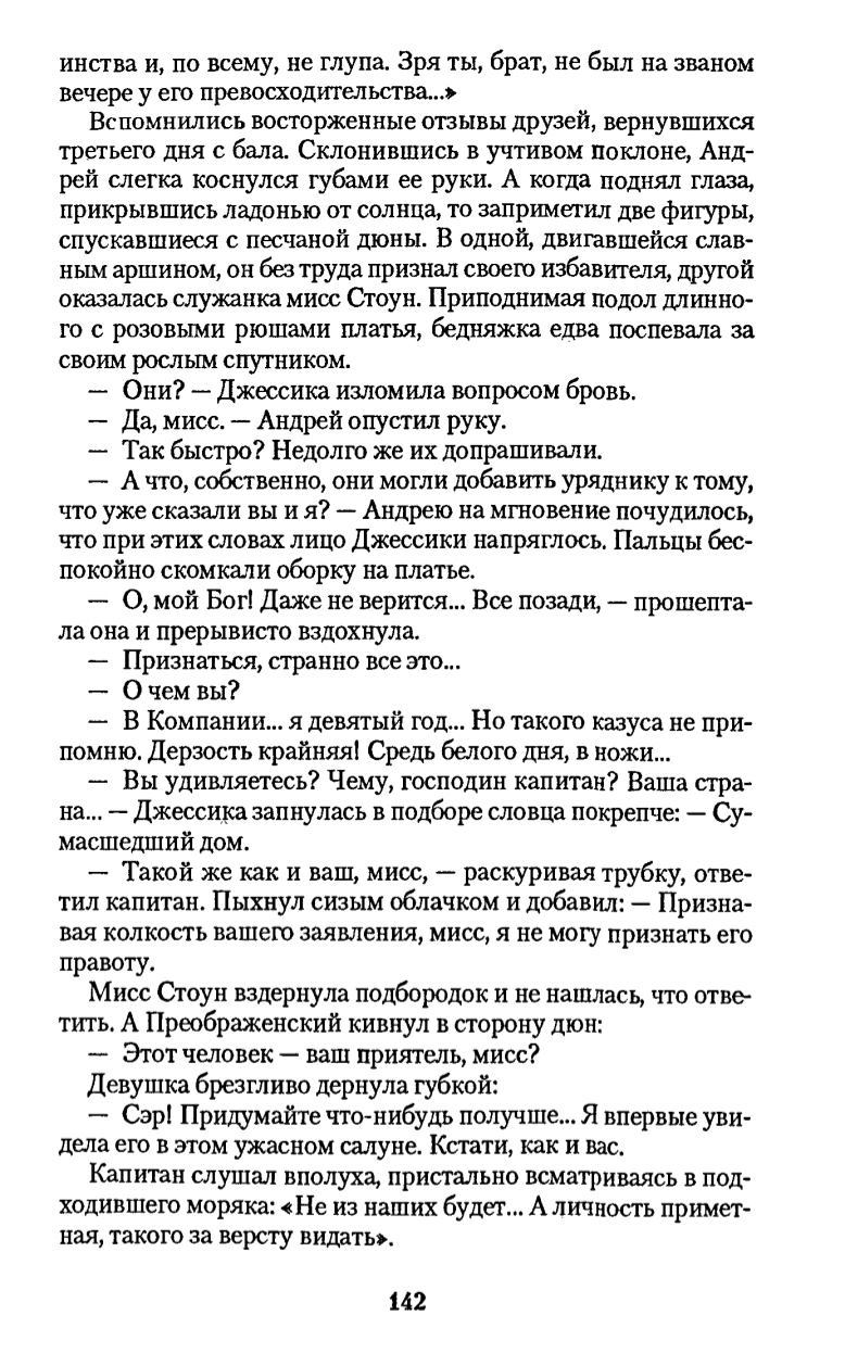 — Такой же как и ваш, мисс, —раскуривая трубку, отве